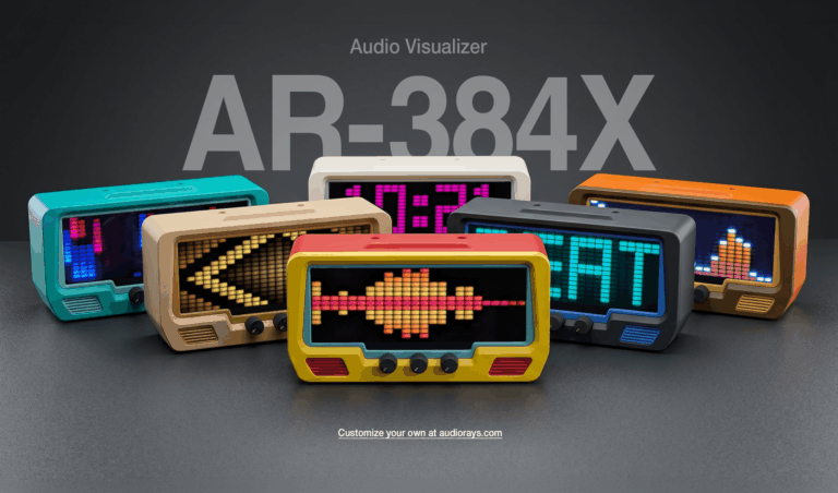 The AR-384X features a 384-LED display that reacts to music in real time. It works with a built-in microphone or AUX line-in, so it can be used with turntables, speakers, TVs, computers, gaming setups, or studio desks. It also doubles as a display stand for a vinyl sleeve, CD, phone, or small tablet.
